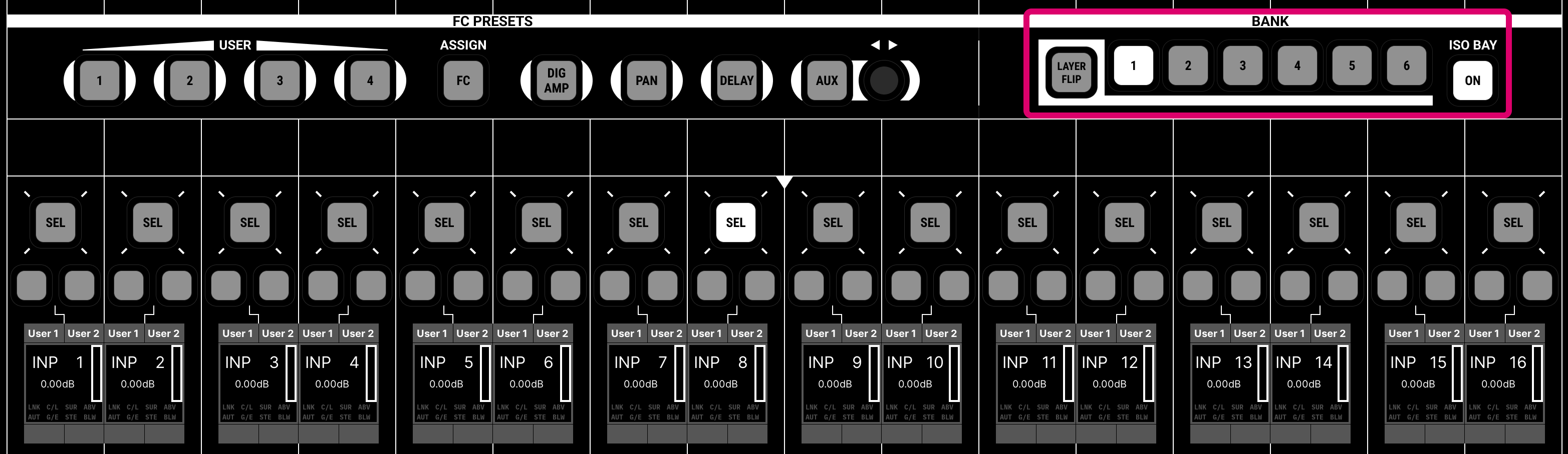 - The global BANK selections affect all fader strips across the console, except for those in an isolated bay or with an individual strip ISO active.