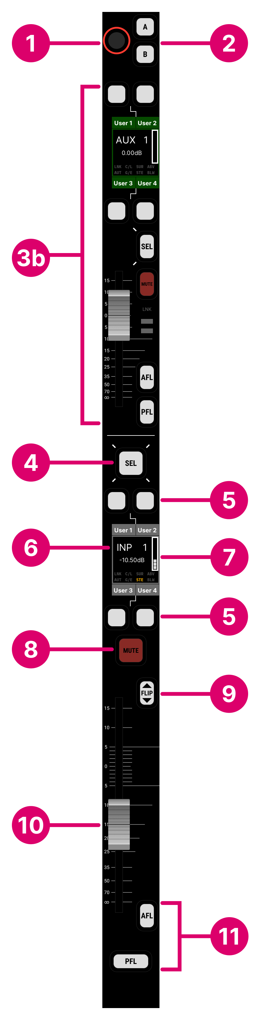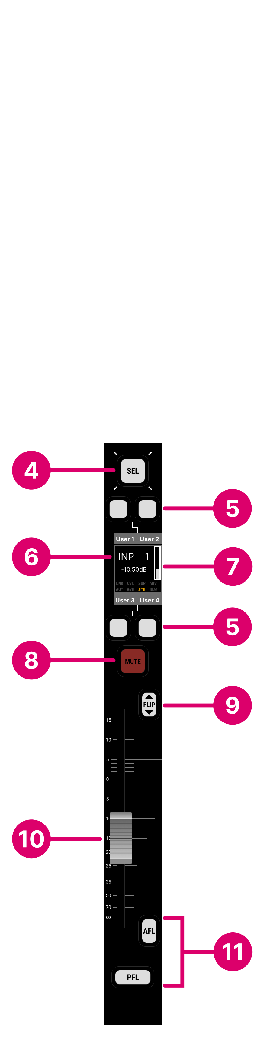 1. Input Gain 3a. Free Controls 3b. Second Fader 6. Label 7. Input Meter & Status Indicators 8. Channel Mute 9. Layer Flip 10. Fader 11. AFL & PFL |