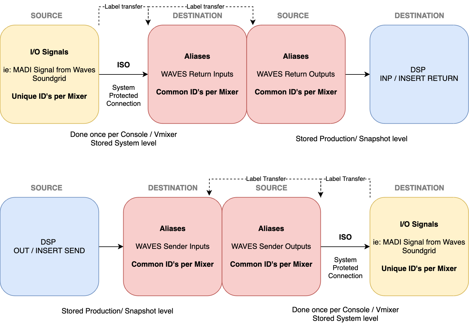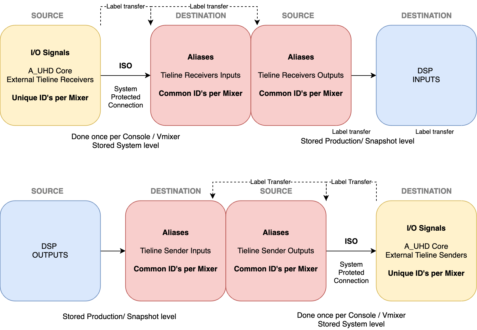 The following diagrams illustrate how this works. Aliases ensure consistent signal IDs across different control systems, after the External Tielines of the A_UHD Core are mapped.