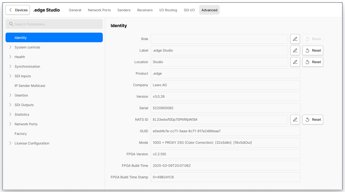 | Identity | Role | Text entry | The first three fields can be set by the user to help identify individual blades. For example: Role = Studio 1 Cameras; Label = Edge1; Location = Rack 3-1. |