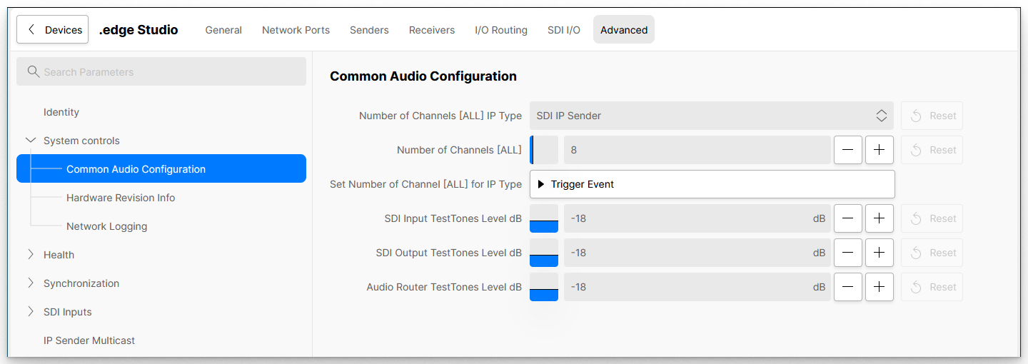 - Common Audio Configuration - can be used to set the number of audio channels (for IP senders/receivers) or adjust the audio test tone levels.