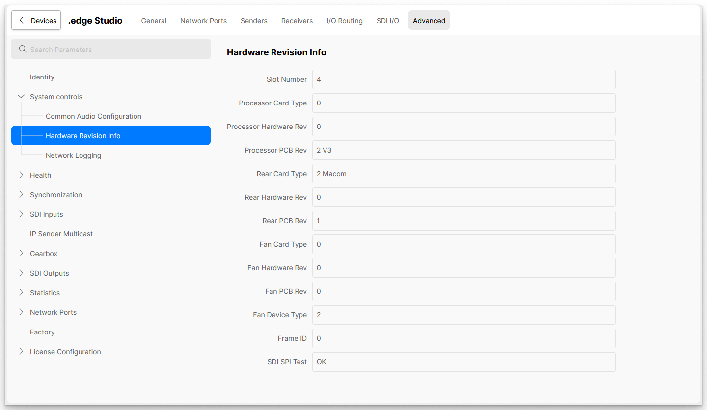 - Hardware Revision Info - displays information about the hardware fitted to the processing blade.