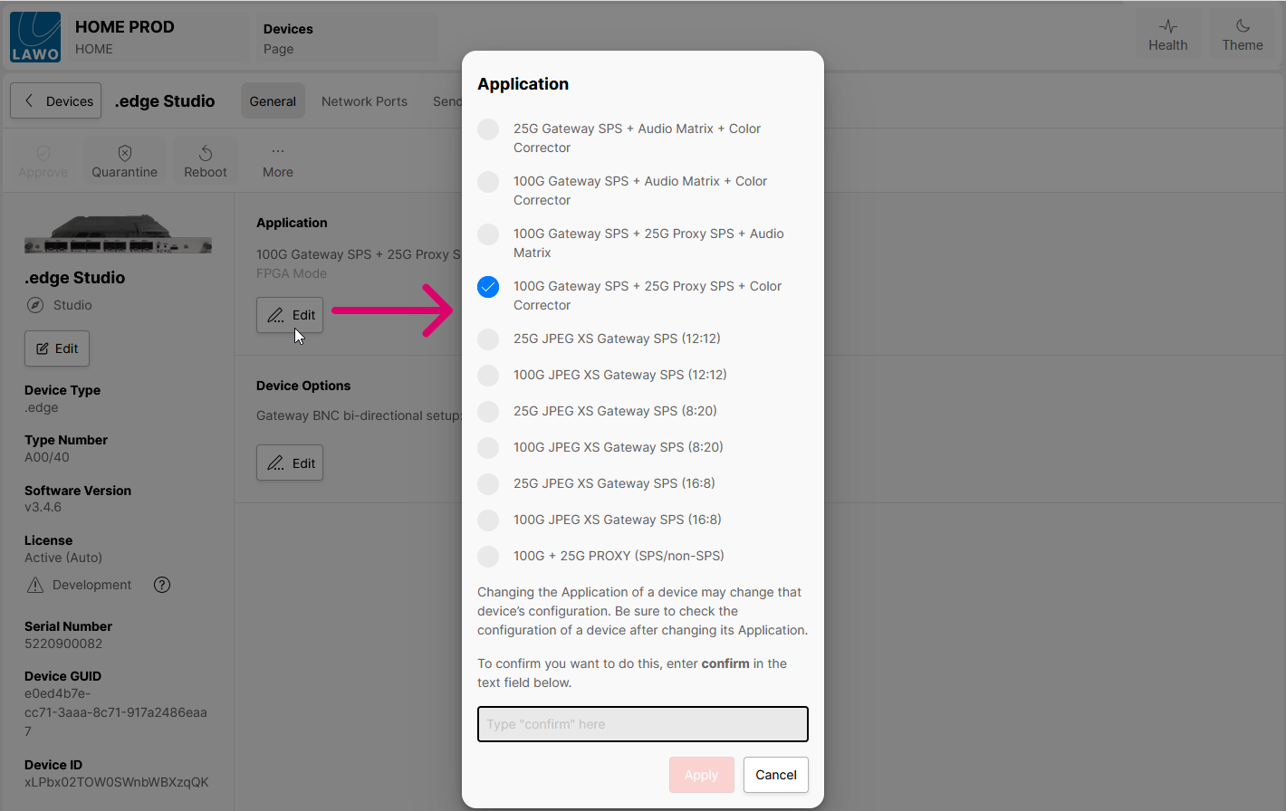 You can use Fetch License to fetch any newly available perpetual licenses (from HOME), or use the Subscription License fields to unlock a licensed option using Lawo Flex credits. This can be done either before or after the change of mode (as described here). - For security, the change of mode must be confirmed: click on the pencil icon (to open the confirmation dialog), type in "confirm" and then click on Confirm.
