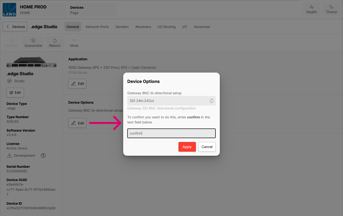 The possible options are dependent on the Additional SDI parameter (as described above). - For security, you must enter the confirmation text and then click Apply.