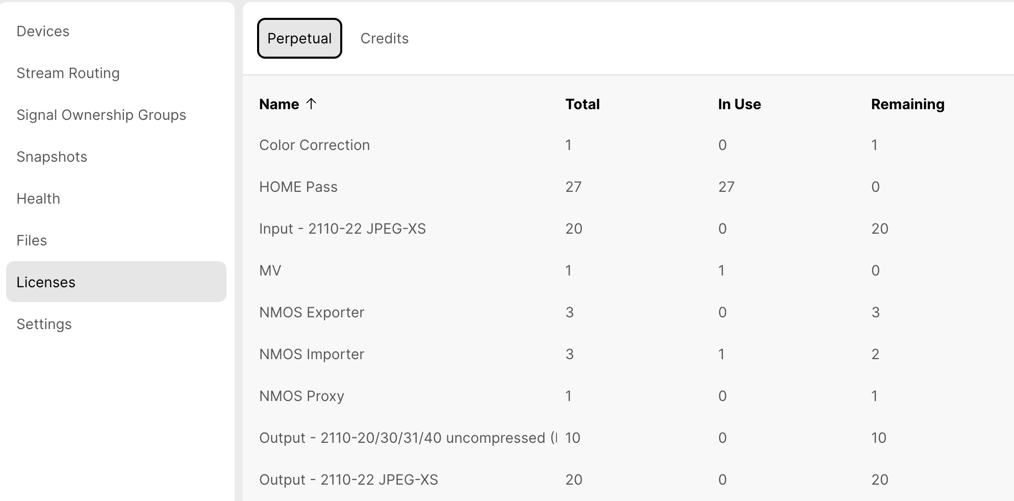 The Perpetual tab shows a sortable list of all available license types with Names, Total amount, the licenses In Use and the Remaining ones.