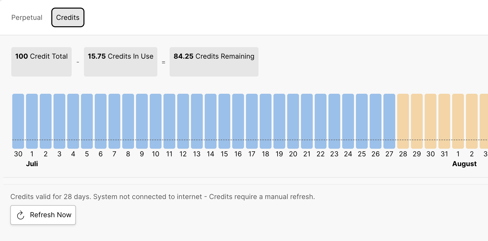 The bargraph is visualizing available credits over time. Blue bars indicate the overall credit balance until the day (day and month are indicated as X-axis) these credits need renewal. Yellow bars indicate, that the underlying subscription of credits allows for a next lifecycle, after the allocation has been renewed.