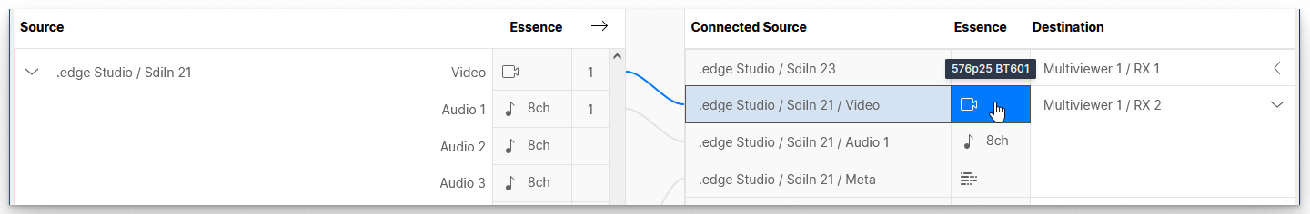 When preparing a connection from a source group, you may see a dotted orange line. This indicates that only a part of the source group can be connected. For example, if the source group contains Video, Audio and Metadata but the destination contains Audio only. In this instance, the connection can still be made, but only for the related flow(s).