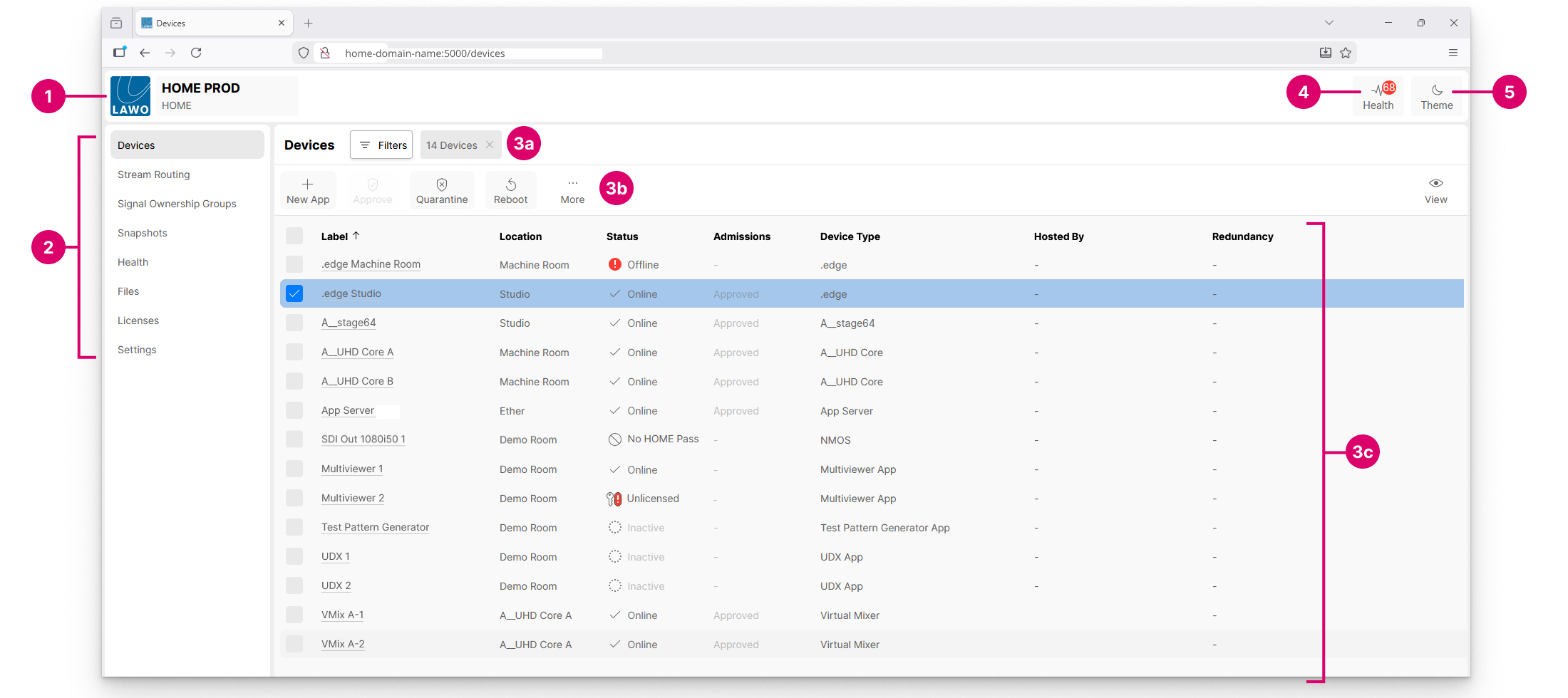 3. Working Area – shows the page contents. For the 'Devices' page, there are three areas: filters (3a), available functions (3b) and the devices list (3c).