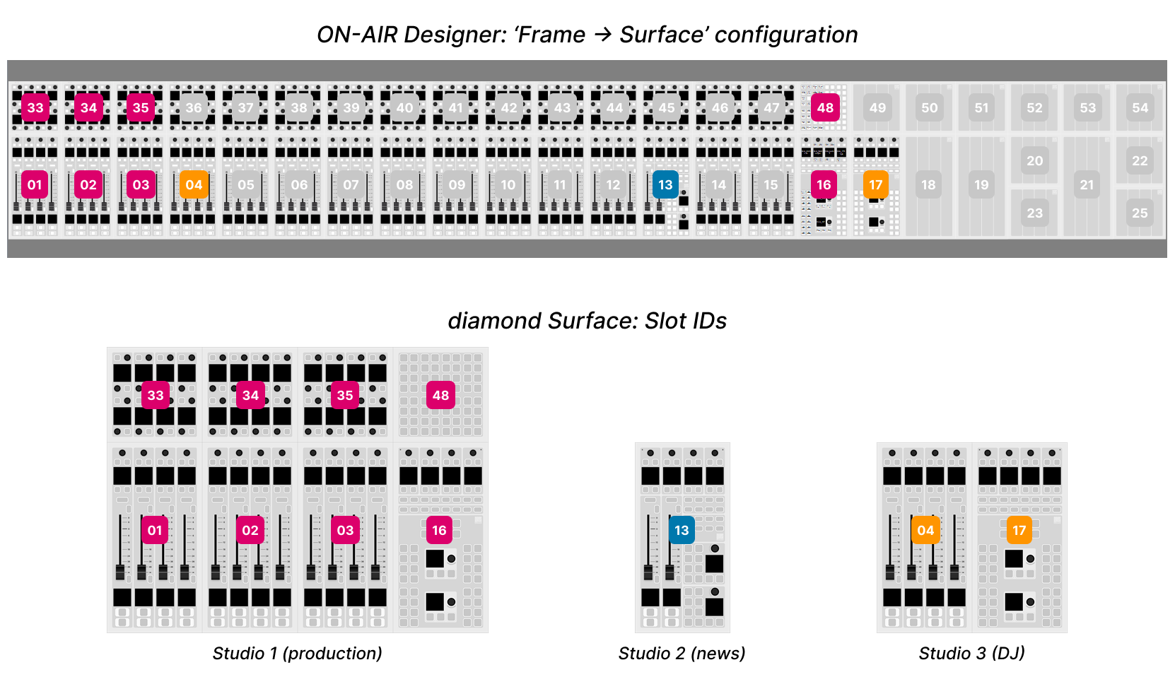 The image below shows how this works for a diamond surface with multiple frames. You can see the ON-AIR Designer 'Frame → Surface' configuration (at the top) and the console frames (below). The slot IDs are highlighted in different colors to show the assignments to each diamond frame.