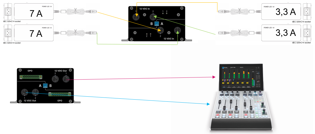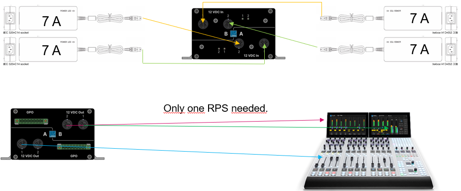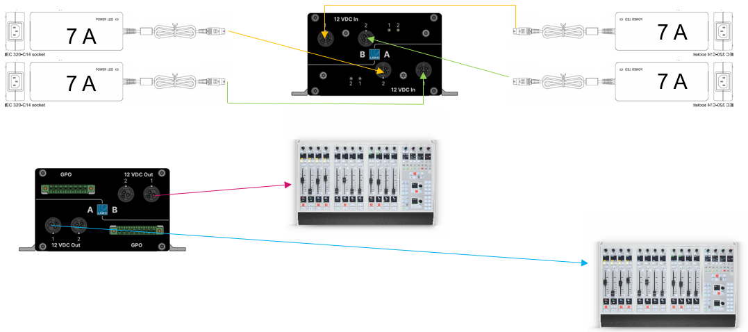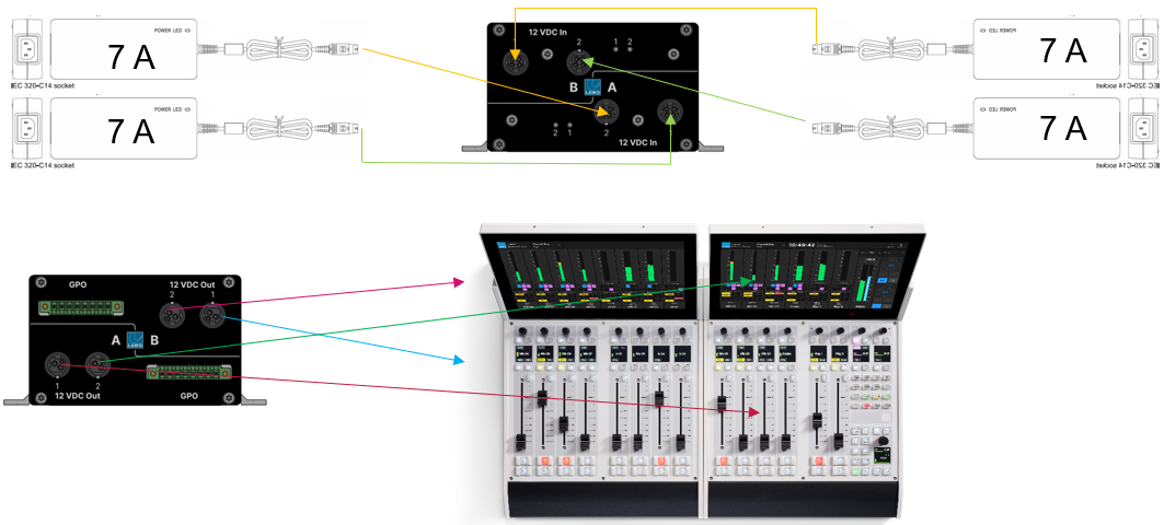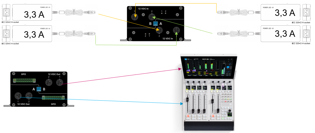 The two GPOs for path A and B can be used to indicate the RPS's redundancy state within the console or Virtual Extension by connecting them to the Power Core's GPIs and configure the desired indication via On Air Designer. Please reach out to the PSG Team for further guidance.