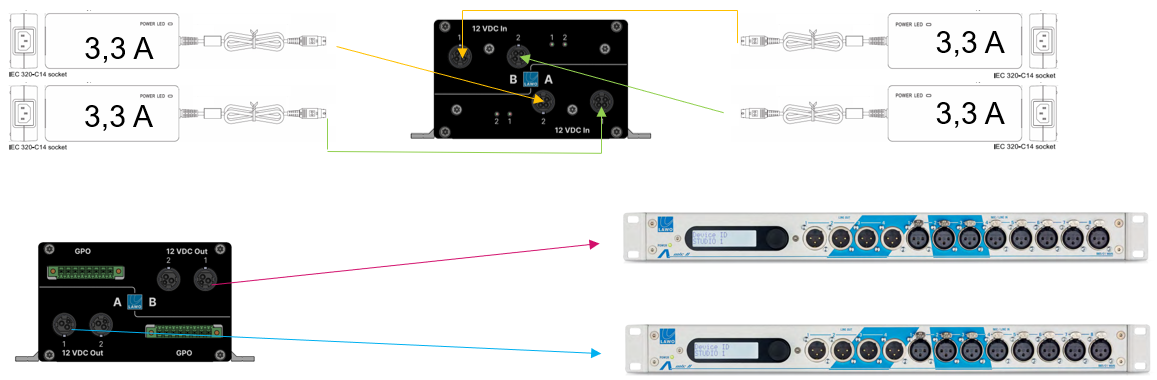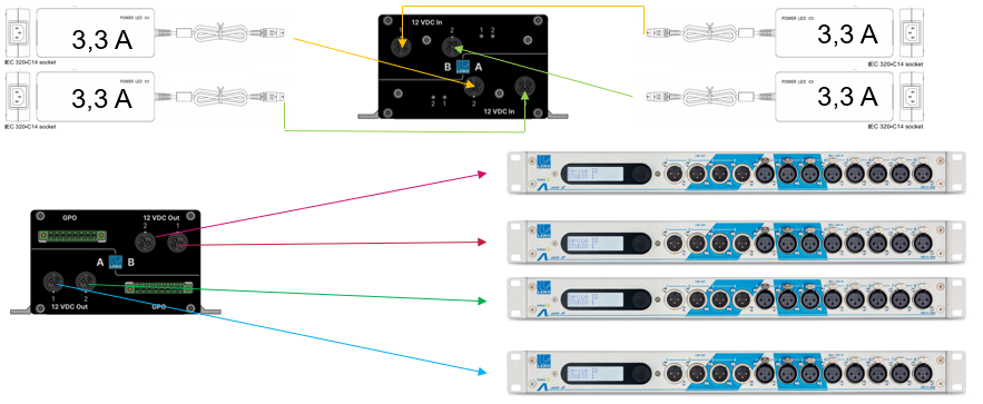 - 4x A__mic8 powered by one RPS (2x 3,3 ADC for two devices connected to path A; 2x 3,3 ADC for two devices connected to path B).