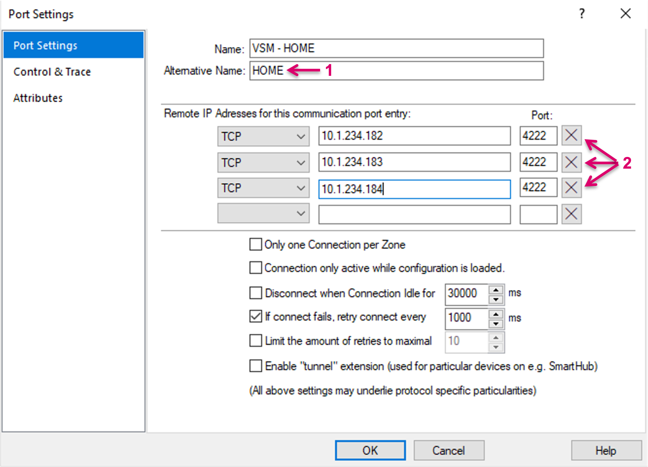 If the connection was lost or the terminal device was turned off, the VSM control system will attempt to re-connect the port after a defined period of time if this attribute is activated. This time frame can be entered in milliseconds under If connect fails, retry connect every... and will be used as default.