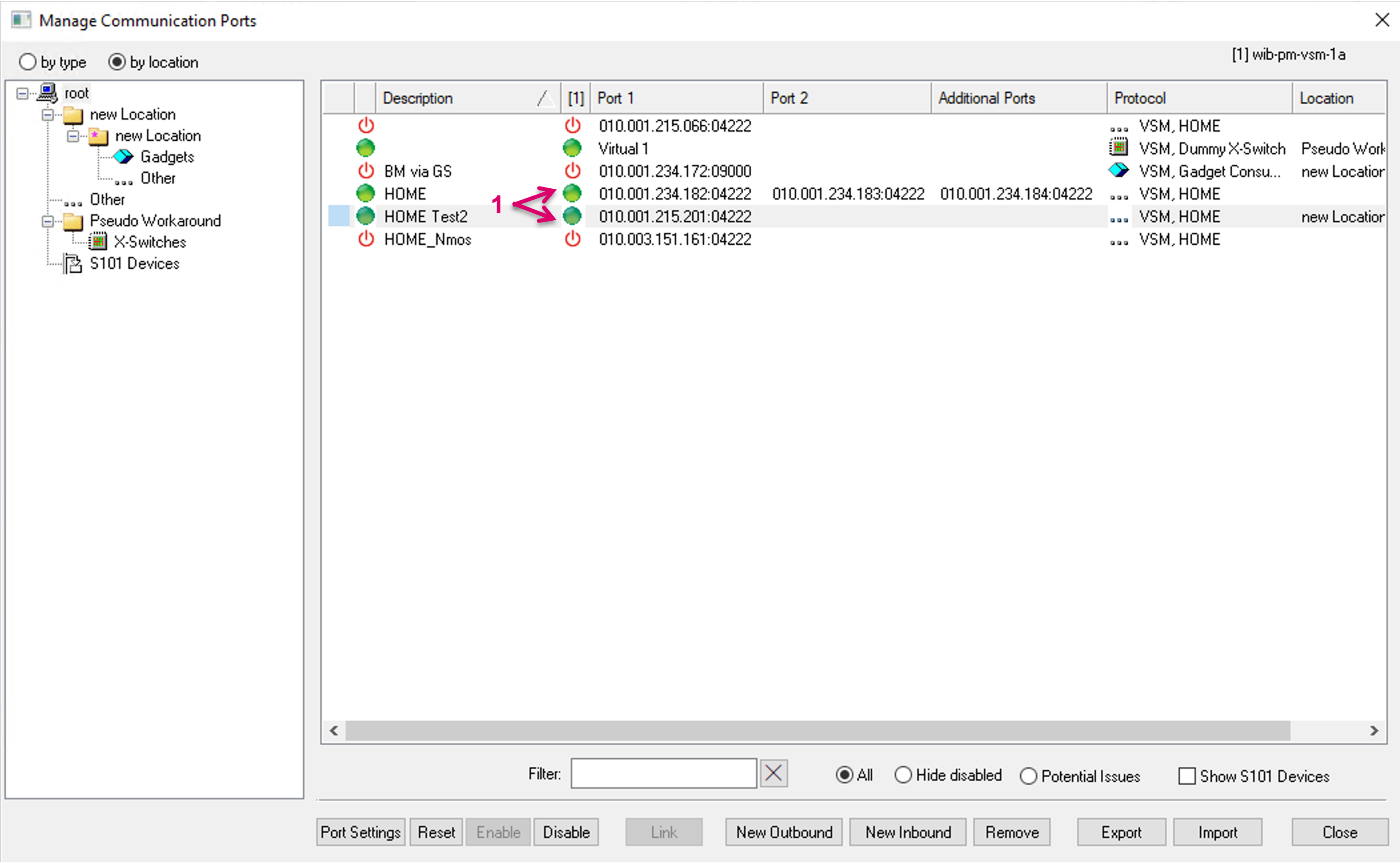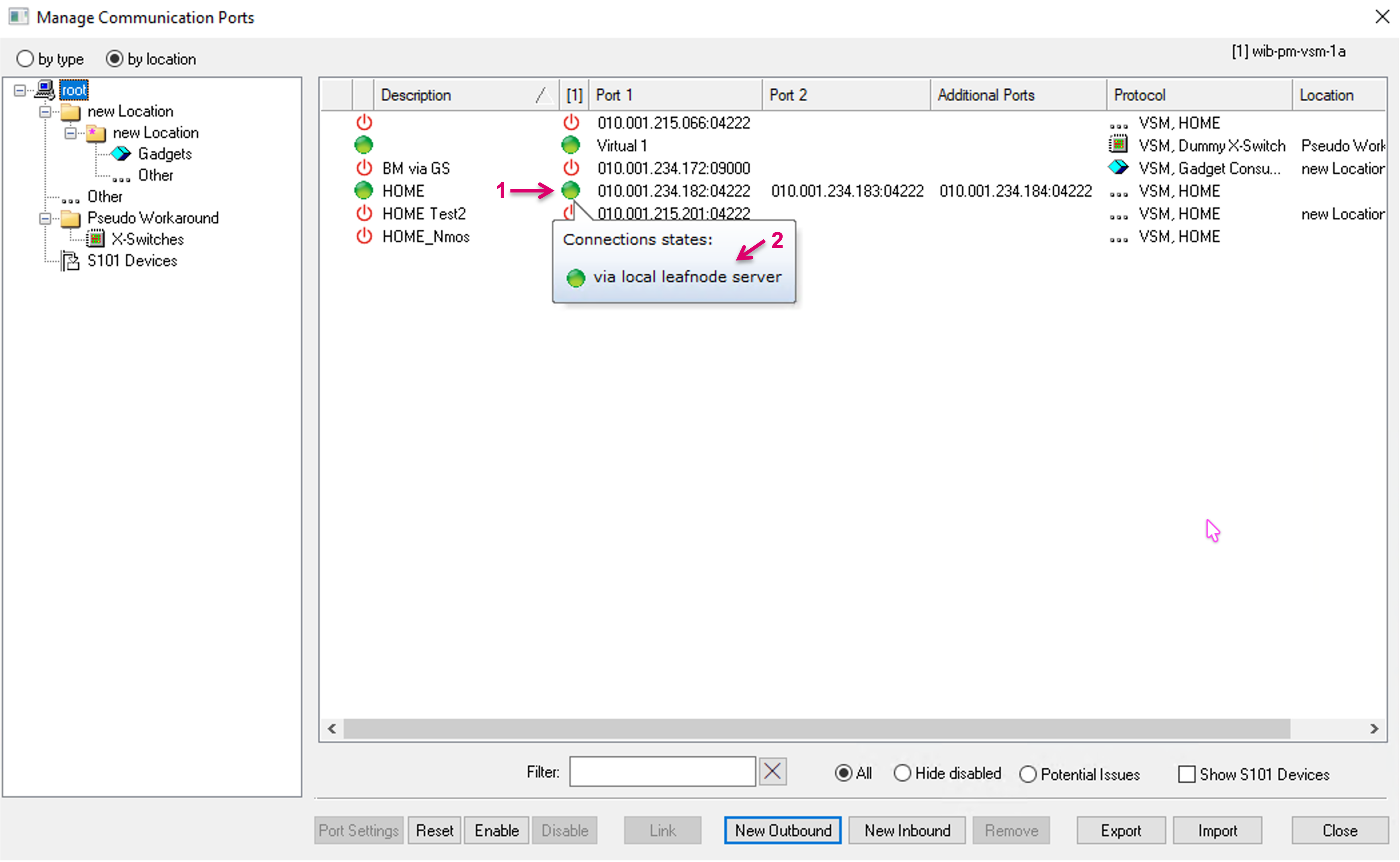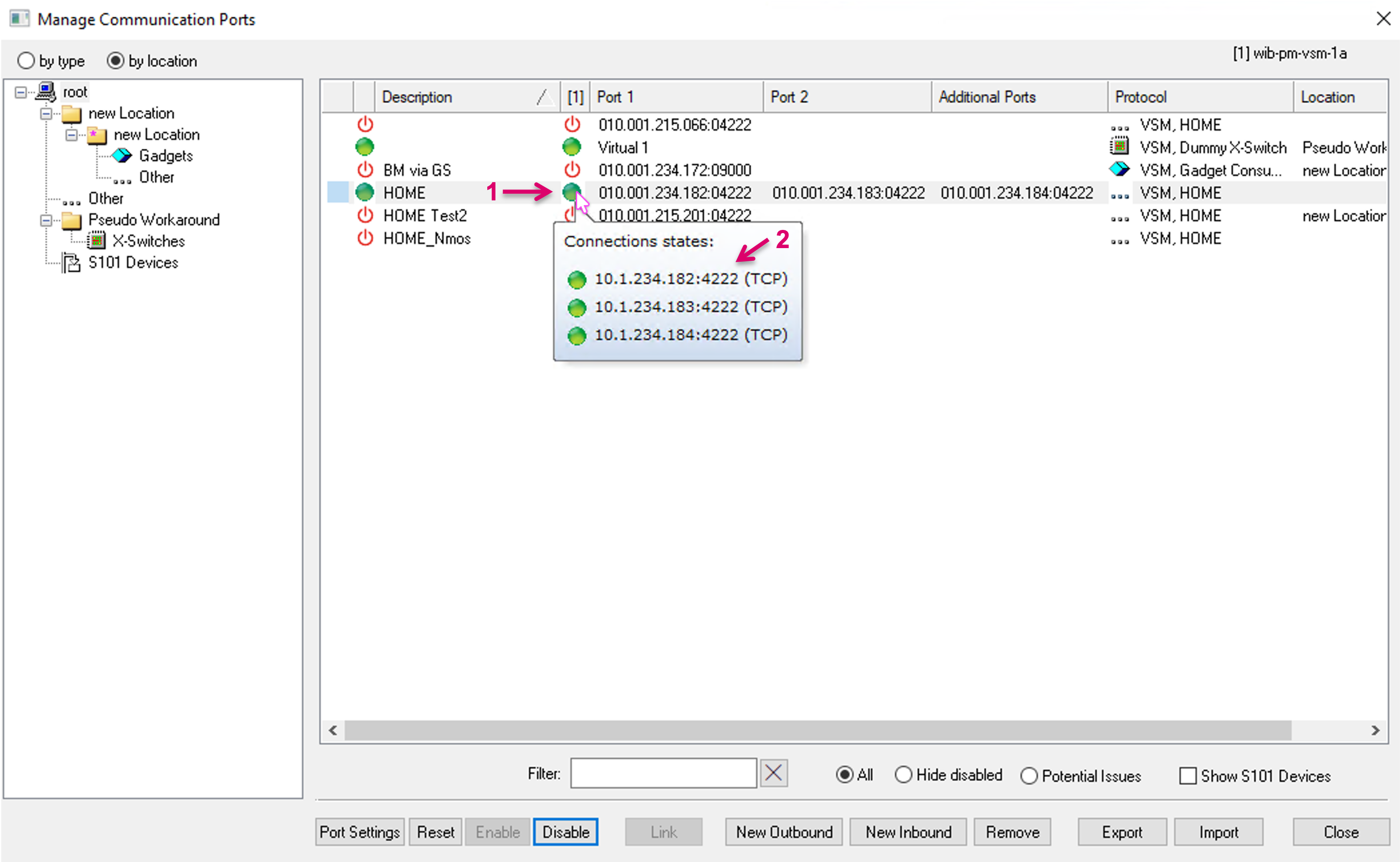For a better organized view in the Manage Communication Ports window, it is possible to create user defined Locations (1). Communication Ports can be dragged and dropped into such Location folders and the view can be filtered by location (2). In the sub-menu of the Manage Communication Ports view, make a right-click and select Add Location (1). Open Properties (3) for additional settings.