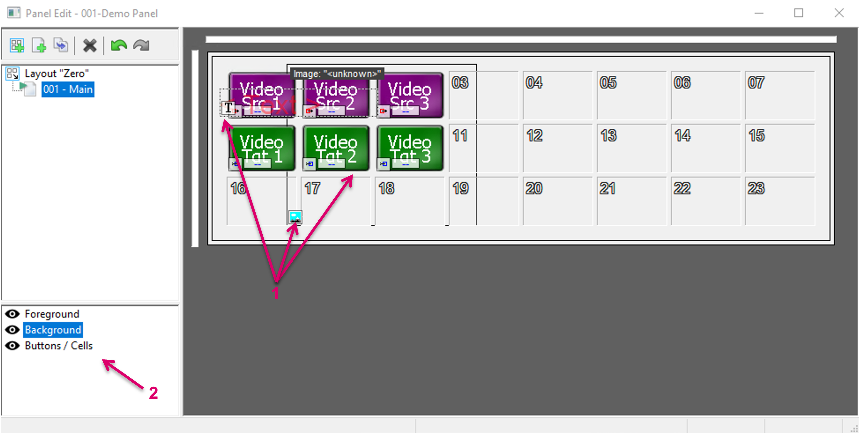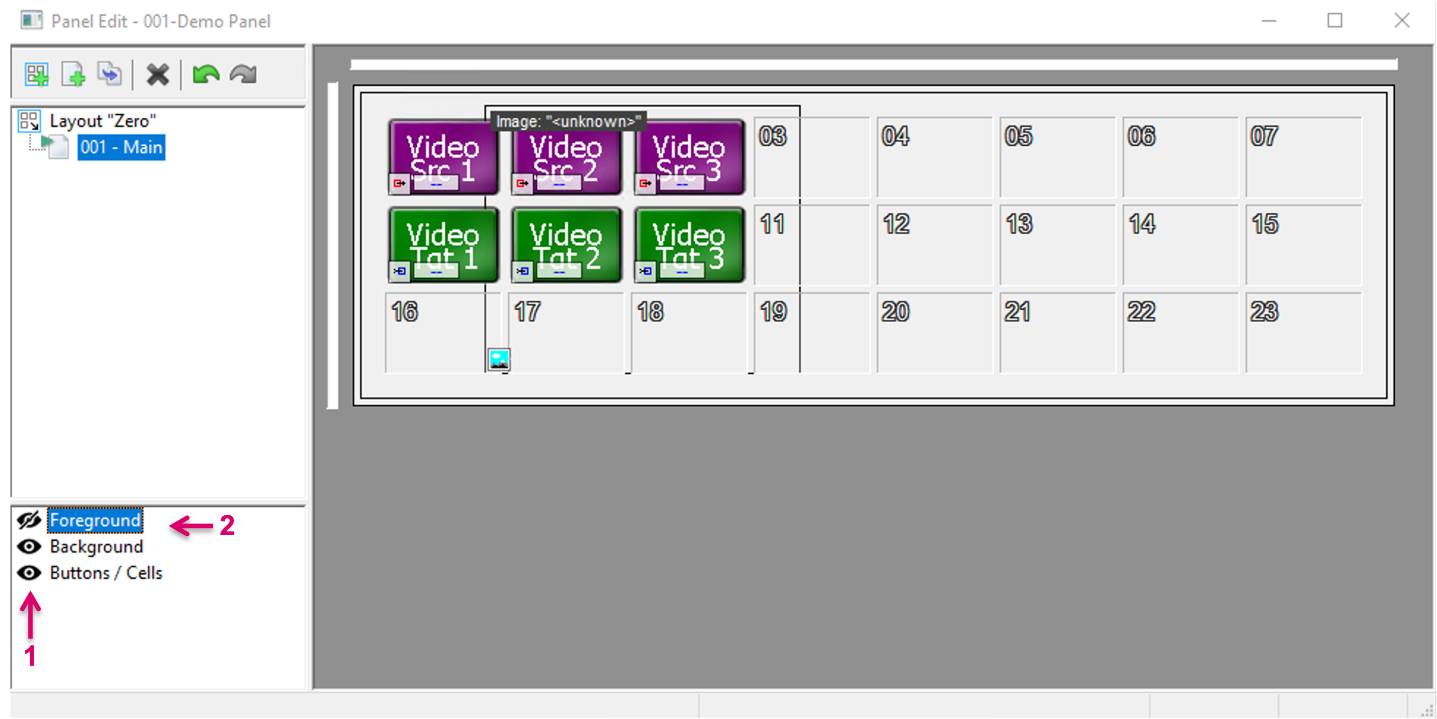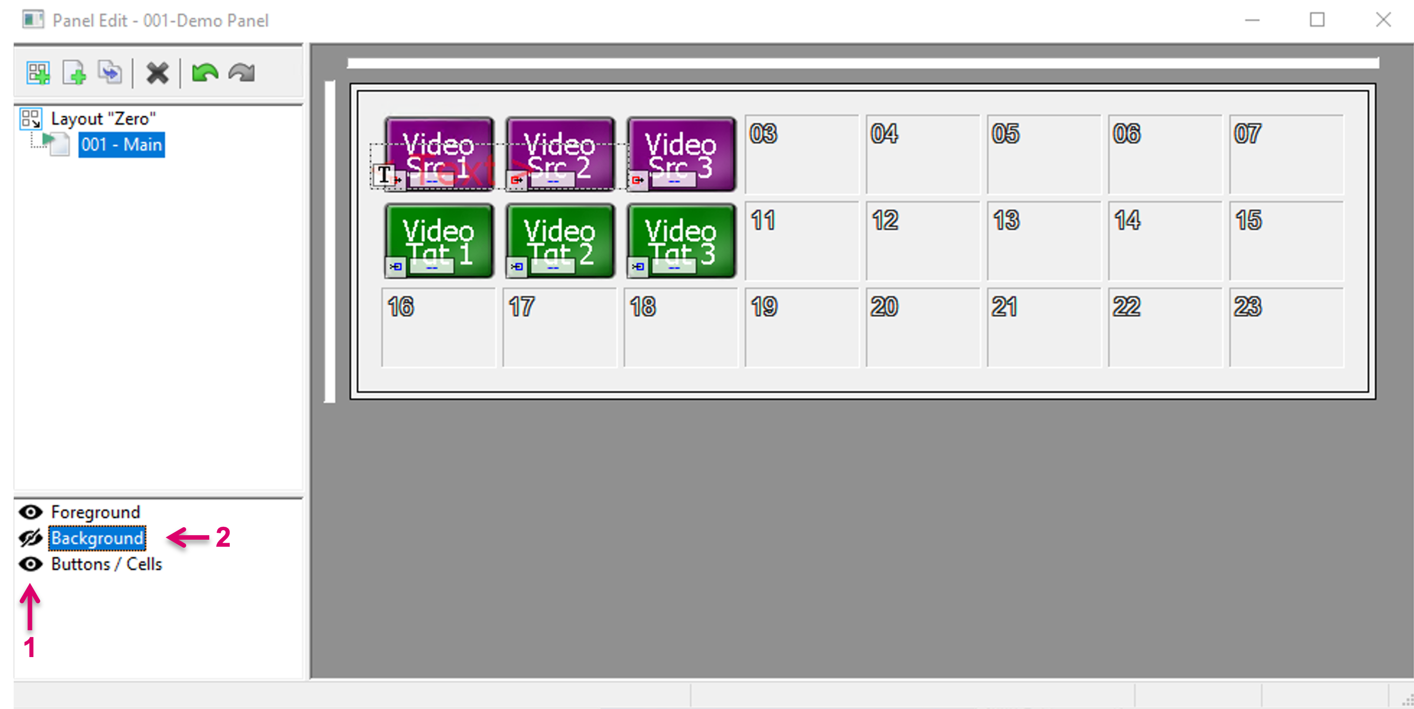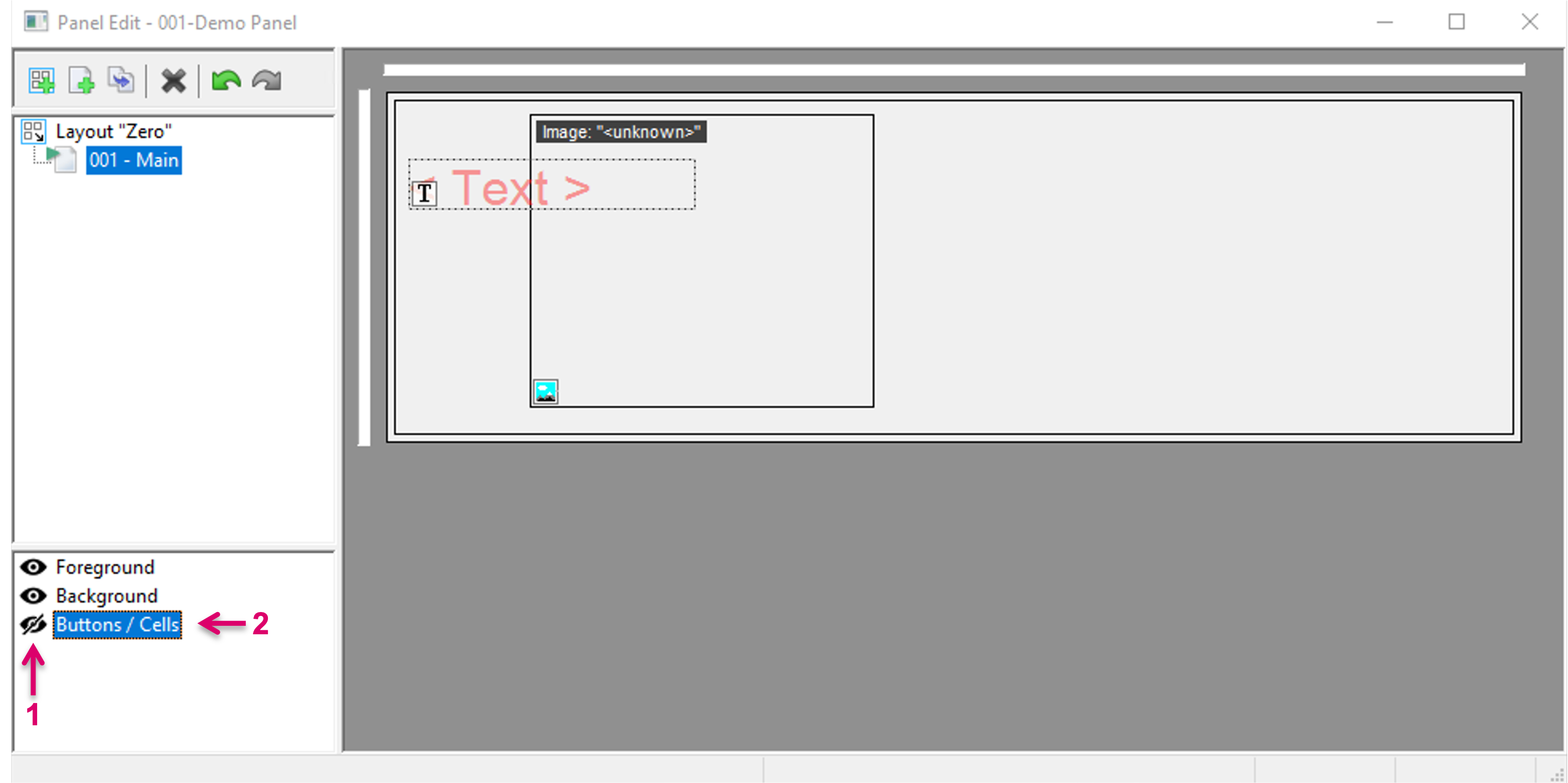 Three default layers are available from the start. By click on the little eye icon in front of each layer (1), items in Foreground (e.g., Clock, SignalList, Storage, Views or Alarms), Background (TextBox and Image) or Buttons/ Cells (2) can be hidden or shown.
