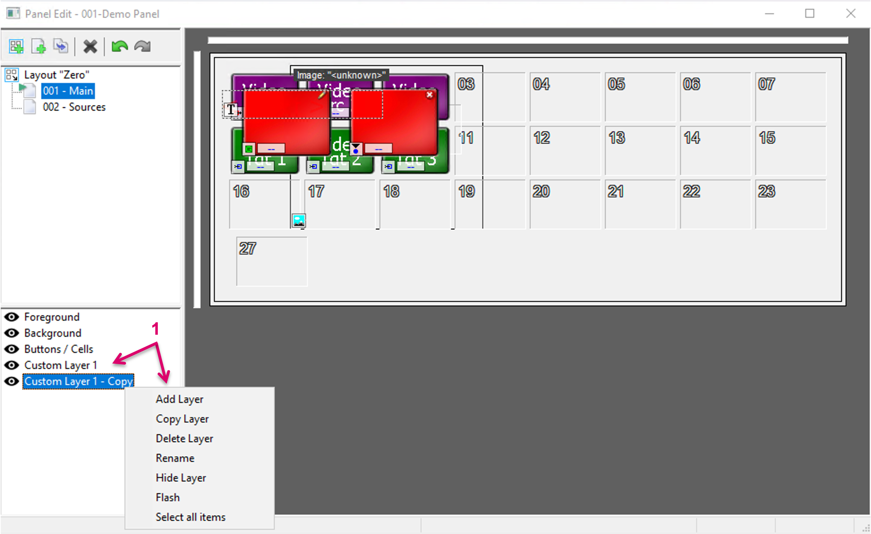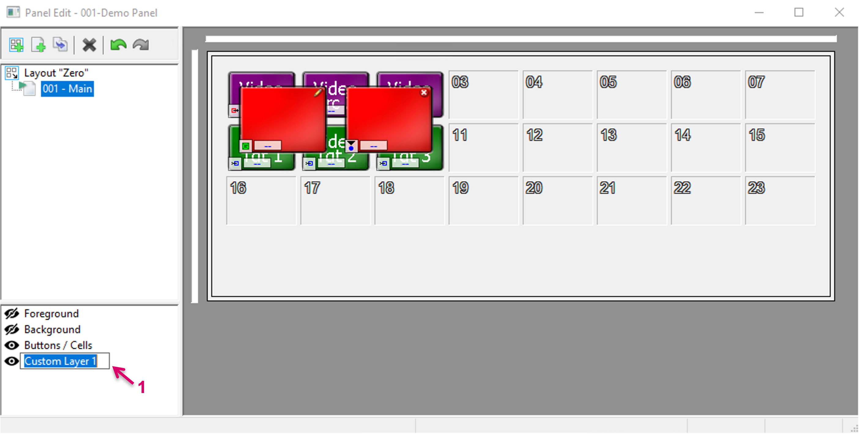 In addition to the default layers, it is possible to create custom Layers. This may be required if buttons/ cells are stacked on top of each other (1) and therefore only specific buttons shall be temporarily hidden. To add a custom layer, just right-click into the layer section and select Add layer (2).