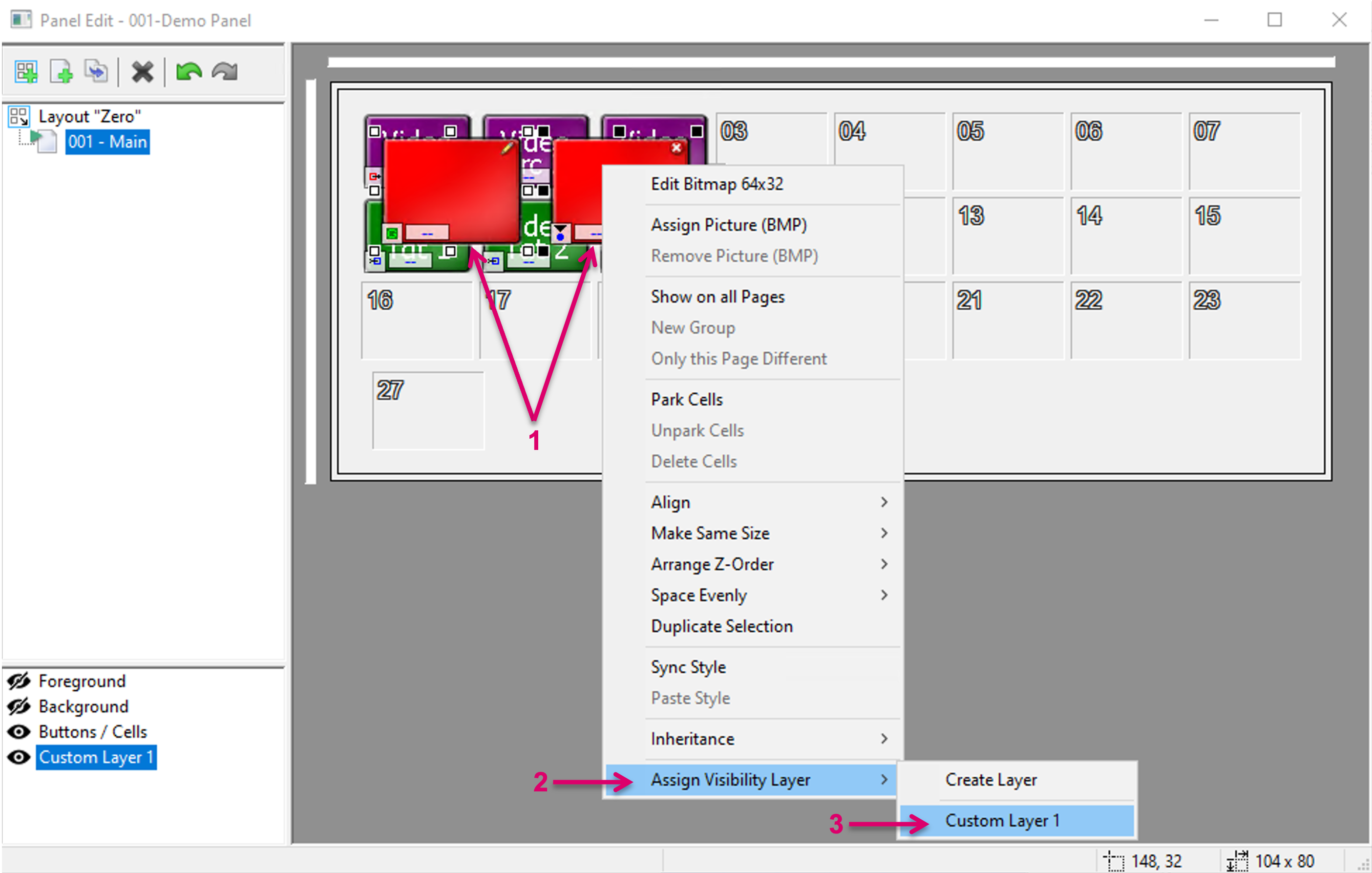 To assign an item and/ or Button/ Cell to a Custom Layer, select it (or multiple by holding shift) with right-click (1), select Assign Visibility Layer from the pop-up window (2) and select the respective Layer (3).