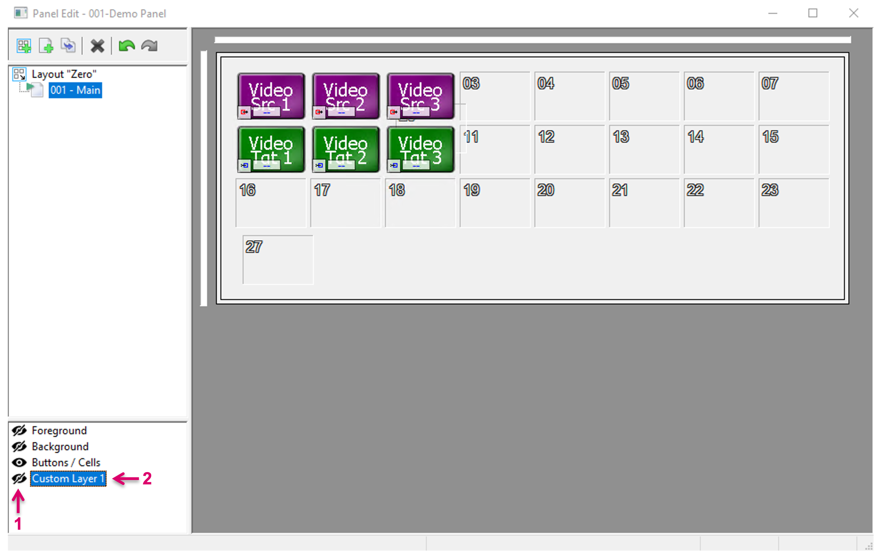 By click on the little eye icon (1) in front of the Custom Layer (2), the assigned items and/ or Buttons/ Cells can be hidden or shown.