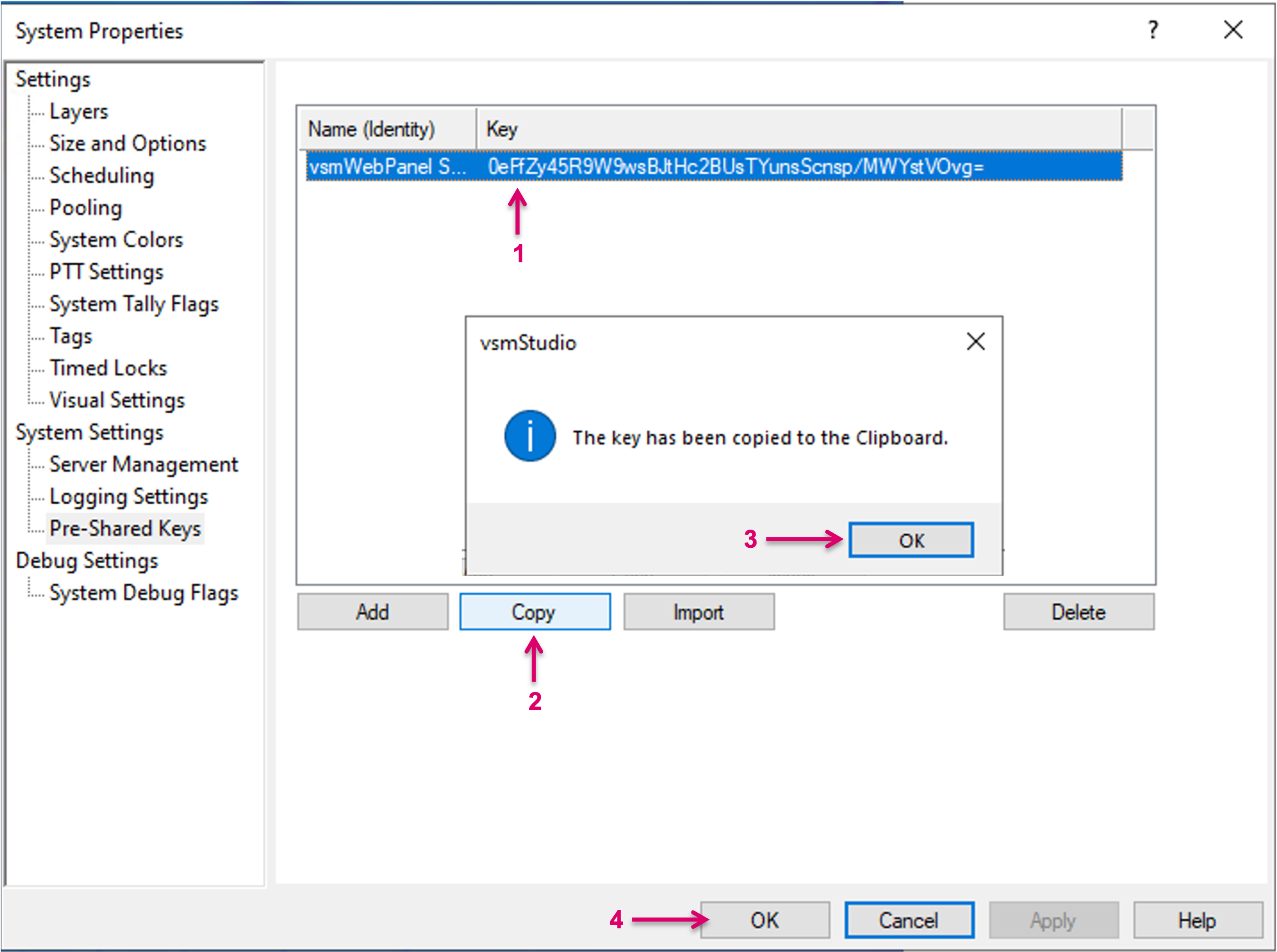Select the new Key in the list (1) and click on Copy (2). The Key will be copied to the Clipboard, confirm with OK (3). Confirm the Pre-Shared Key dialog with OK (4).