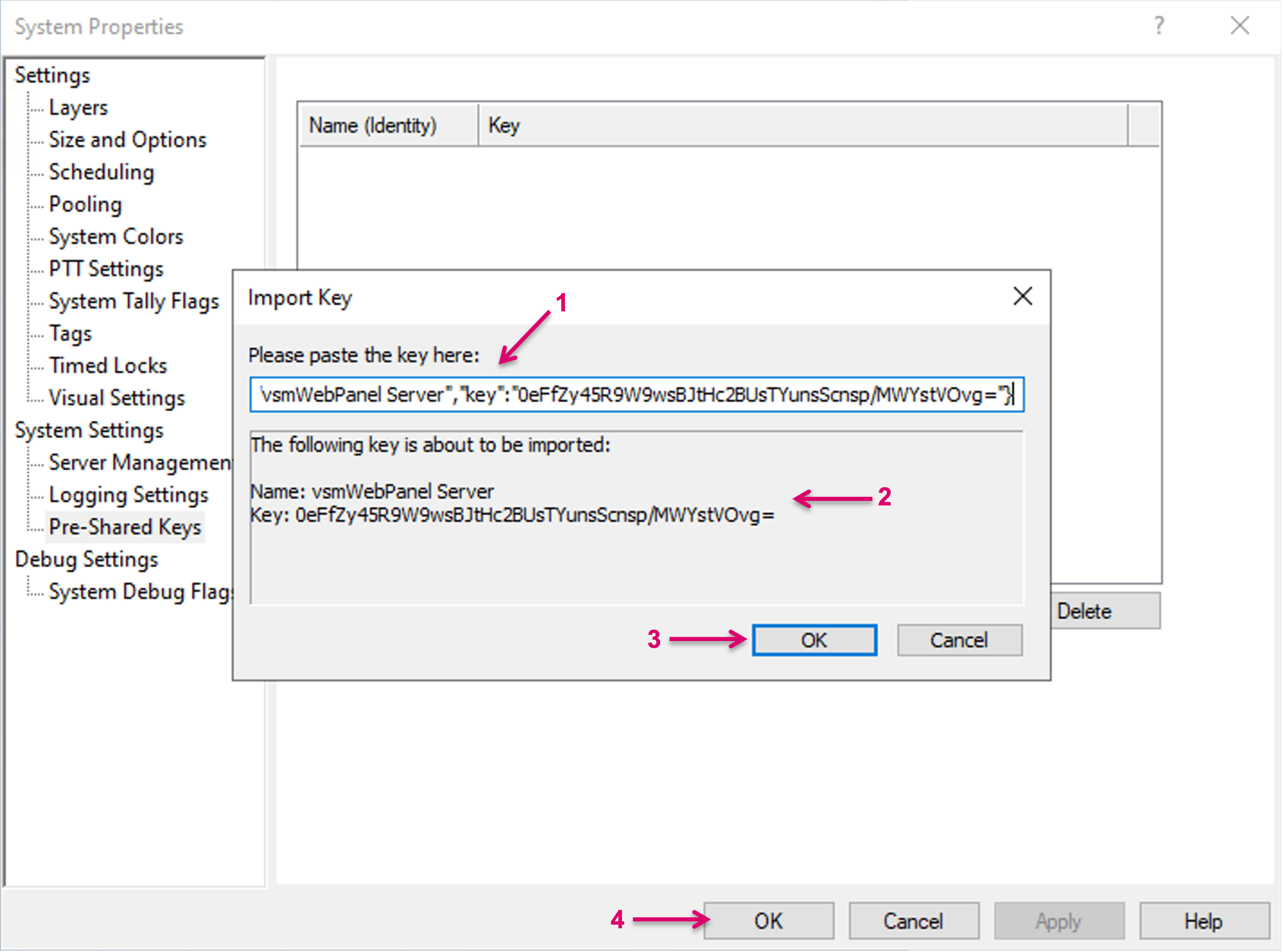 Now paste the copied Key from the other Server (1), check the Key (2) and confirm with OK (3). The Key will be added to the list accordingly, then Confirm the Pre-Shared Key dialog with OK (4).