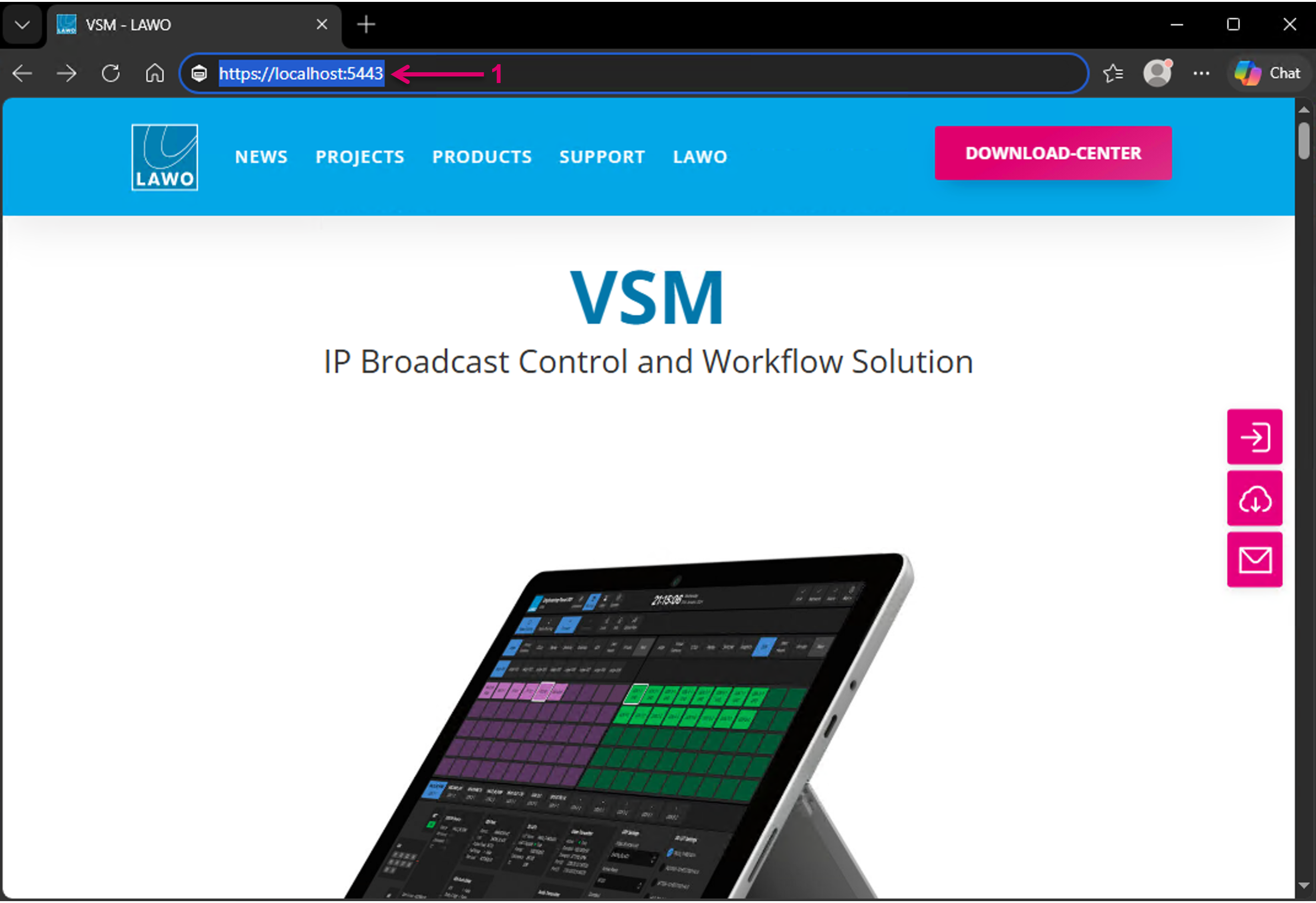 Therefore, open a webBrowser window, like Edge, Chrome, Safari, Firefox, and connect to the vsmWebPanel Server via url: "https://hostaddress:5443" (1).