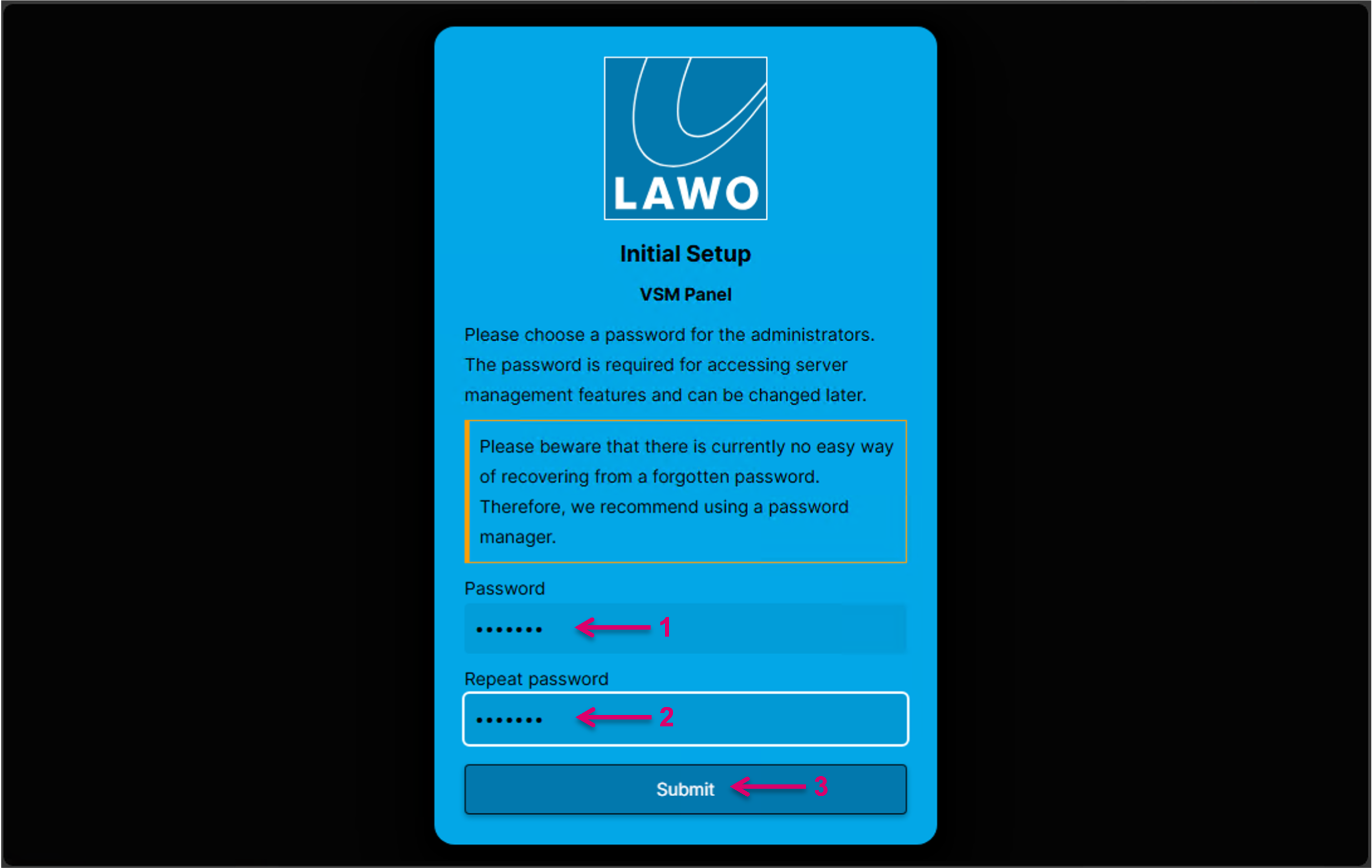 At first connection and part of the Initial Setup, it is required to set an Administrator Password. This password is required for accessing Server specific management features. The password can also be changed later. Set (1) and Repeat (2) the chosen Password. Confirm with Submit (3).