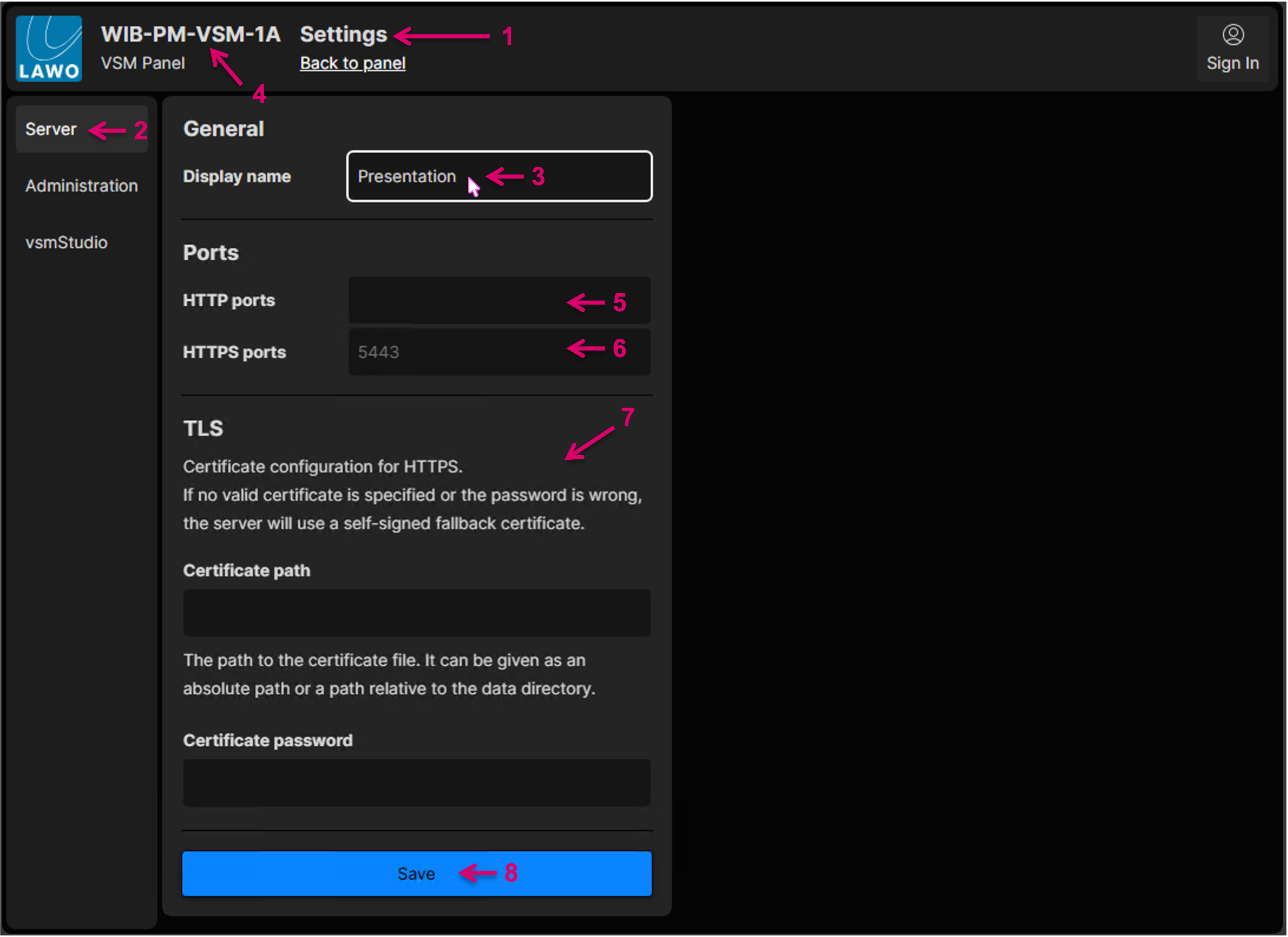 In the next step, the Administrator gets access to the Panel Server Settings (1). Under tab Server (2) an optional Display name can be set (3). Otherwise the name of the Panel Server will be used and displayed (4). Also on this tab, the Ports for HTTP and HTTPS can be set (5). Default value for HTTPS port is 5443 (6). Section TLS allows to configure a Certificate for HTTPS (7). Confirm any settings with Save (8). Please note that some settings might require a server restart to take effect.
