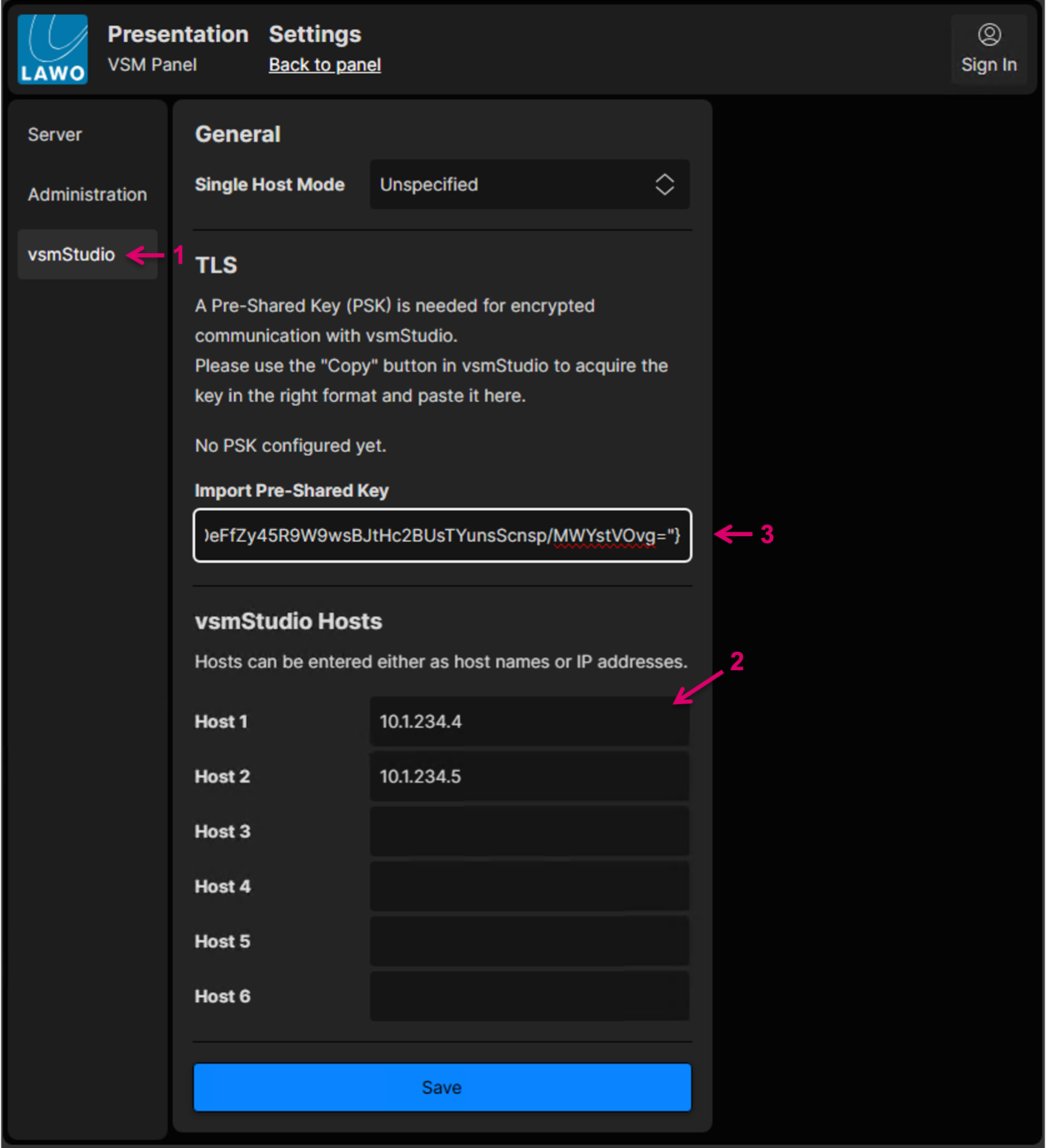 To enable a secure communication between the vsmStudio Host and the vsmPanel Server, it is mandatory to Import a Pre-Shared Key, generated in vsmStudio. Please refer to vsmStudio - Pre-Shared Keys for further information. The Key must be copied from the respective vsmStudio system and pasted here (3).