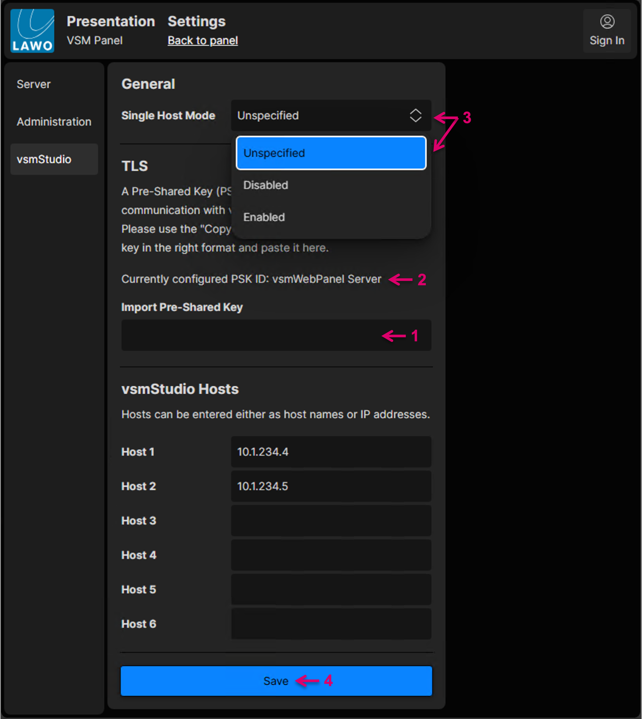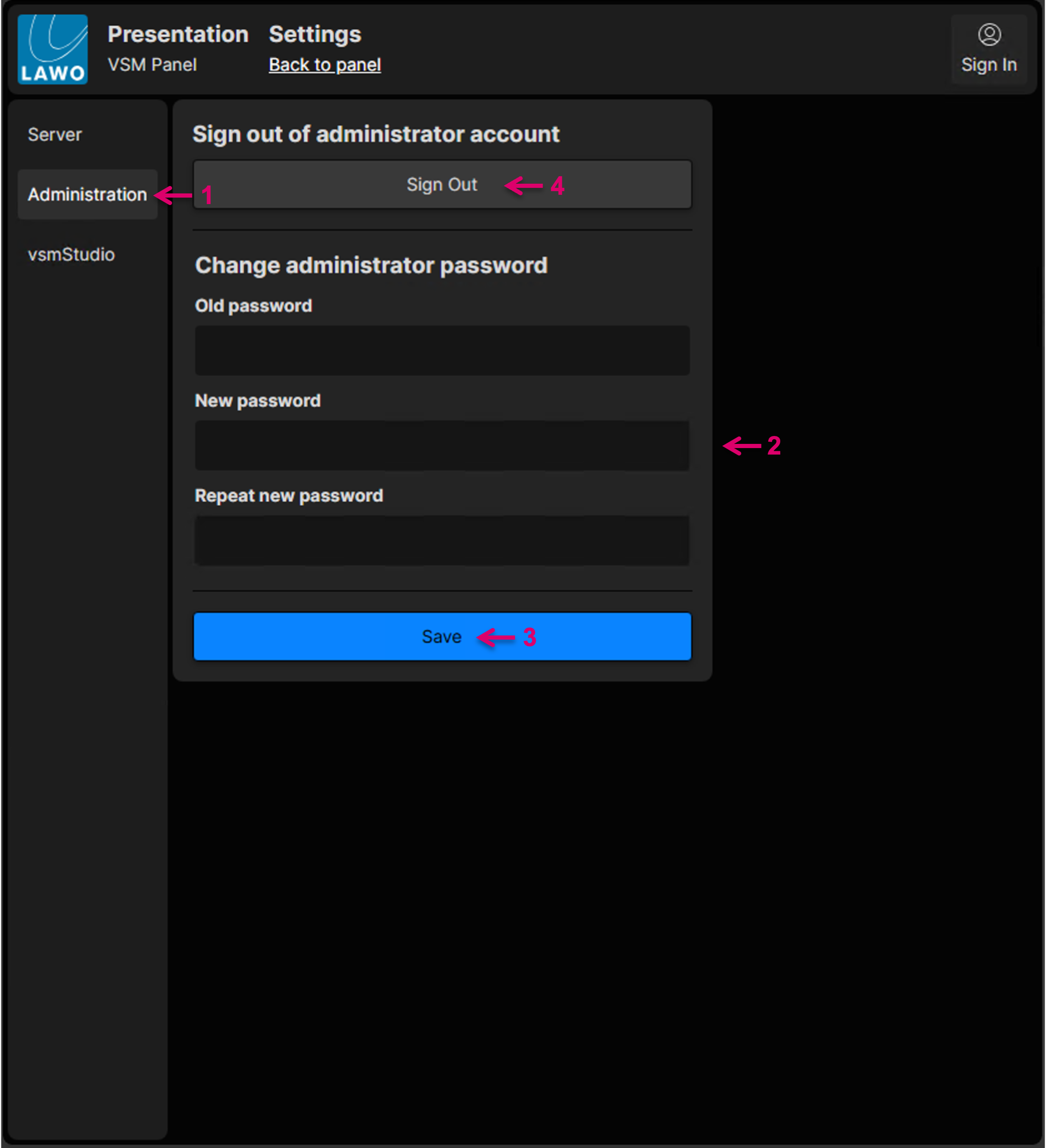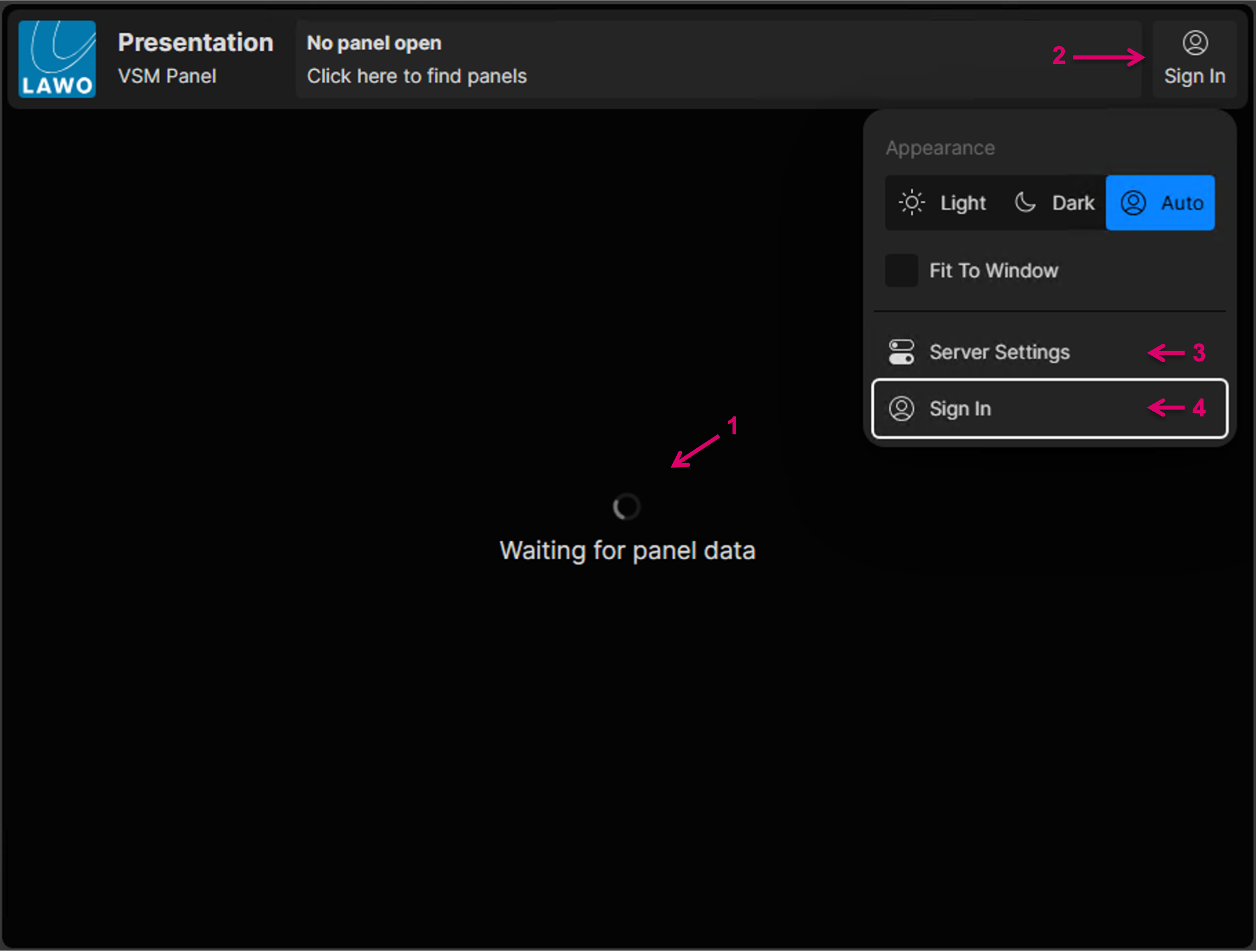 Once Signed Out from the Administrator Account, the Panel will show the "Connecting to vsmStudio" screen (1). The Sign In button in the top-right corner of the screen (2), indicates that no User is signed in at this point. Via click on the Sign In button, it is possible to get back to the Administrator Sign-In, by selecting Server Settings (3). Or a User can Sign In (4) as webPanel Client.