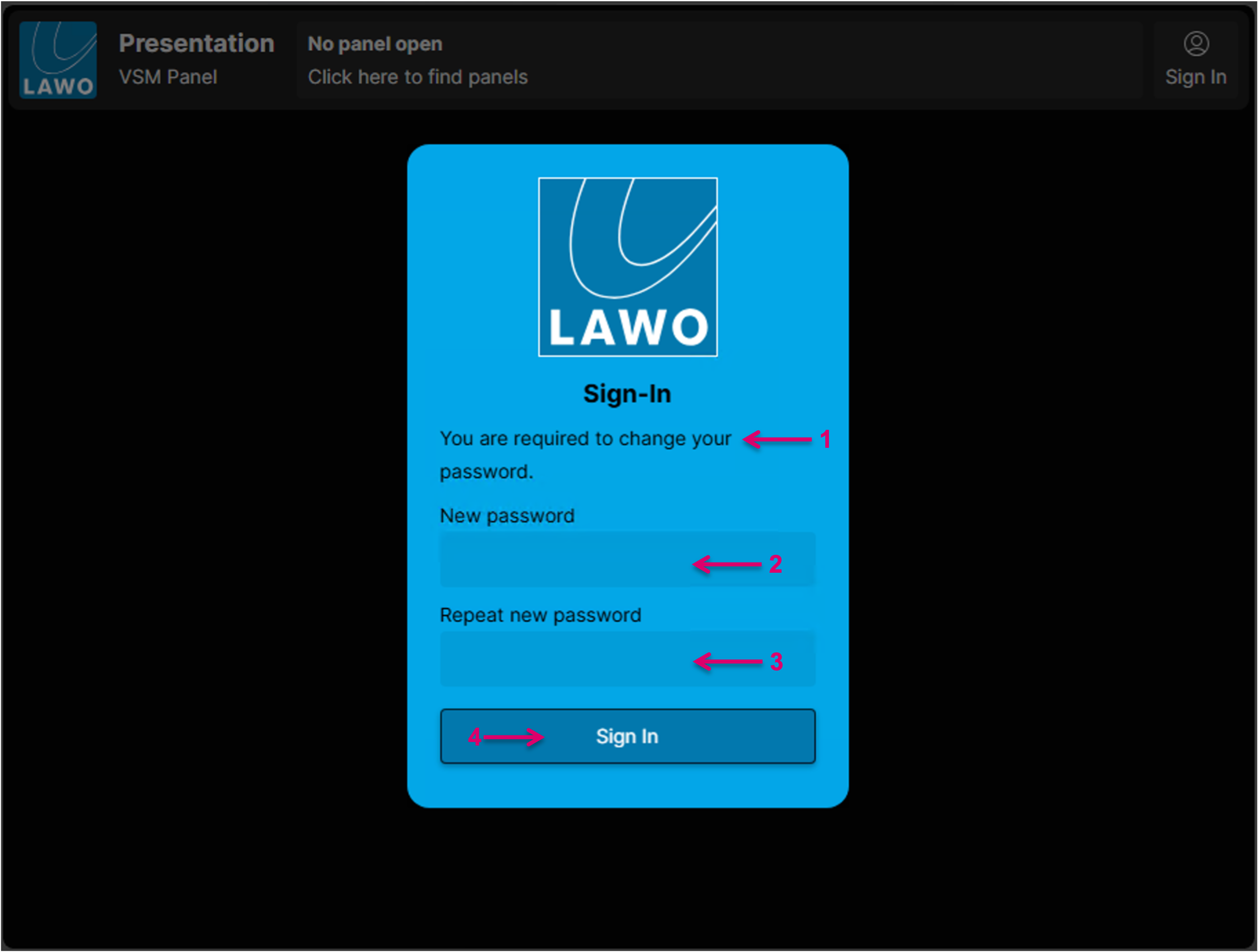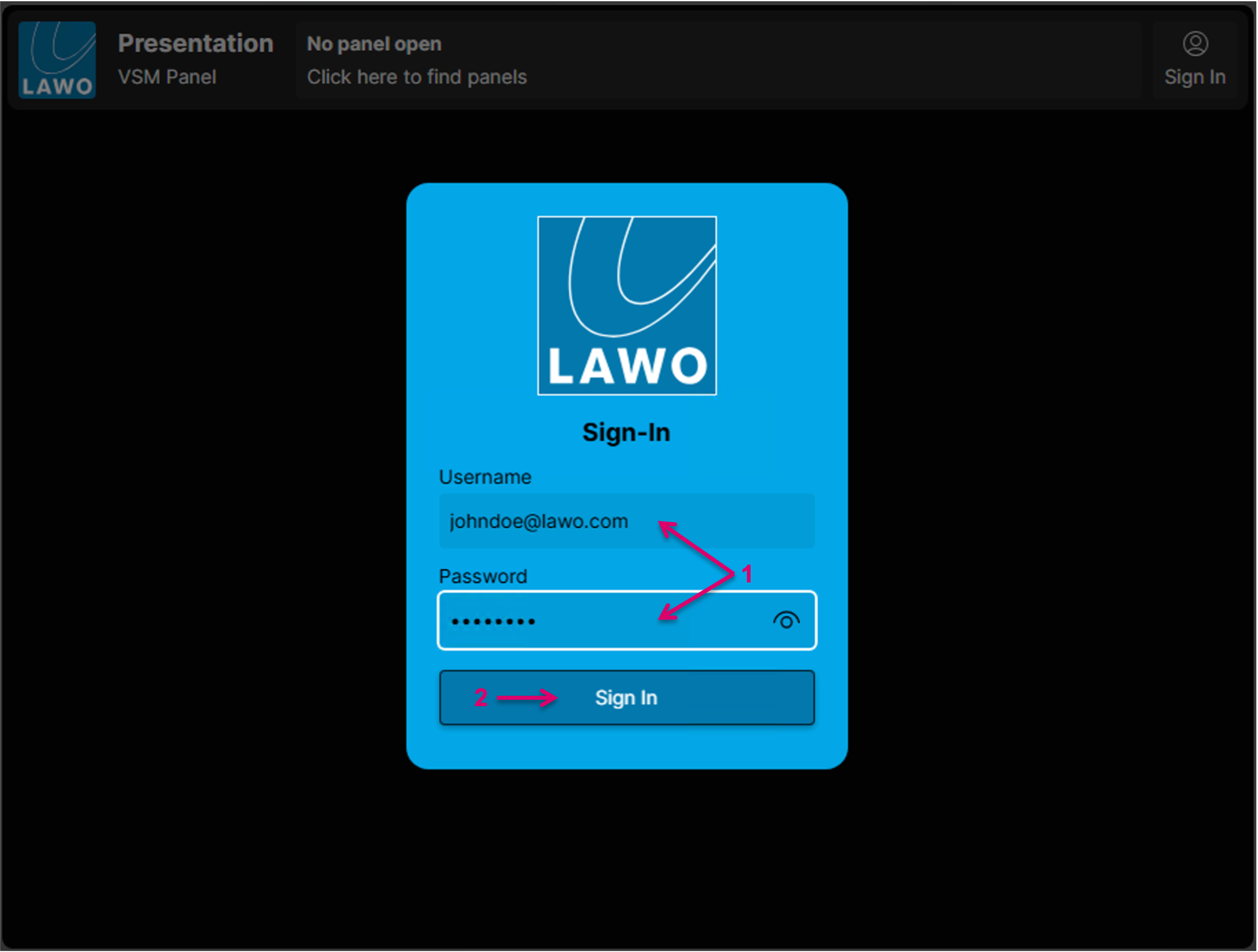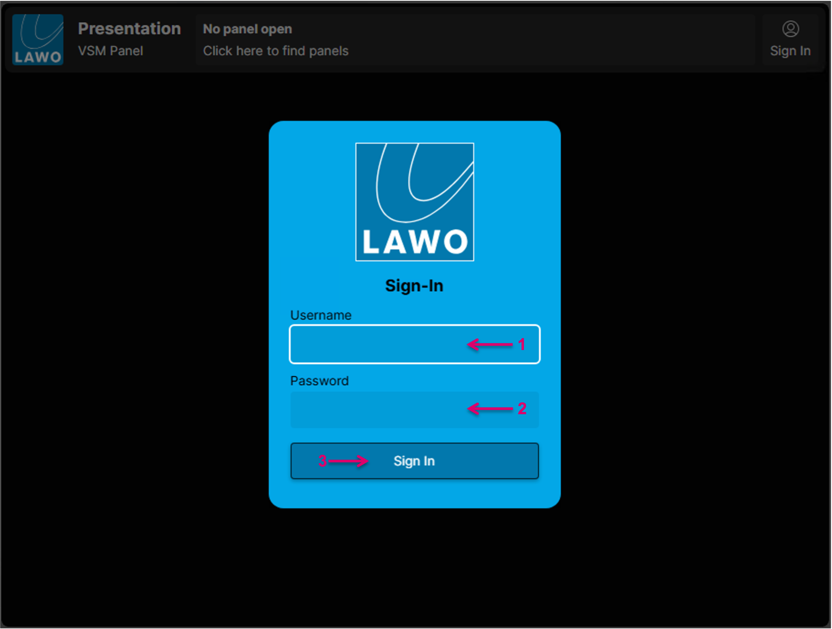 If selecting Sign In, the User can enter his Username (1) and Password (2) and confirm with Sign In (3) to access and operate his assigned Panels.