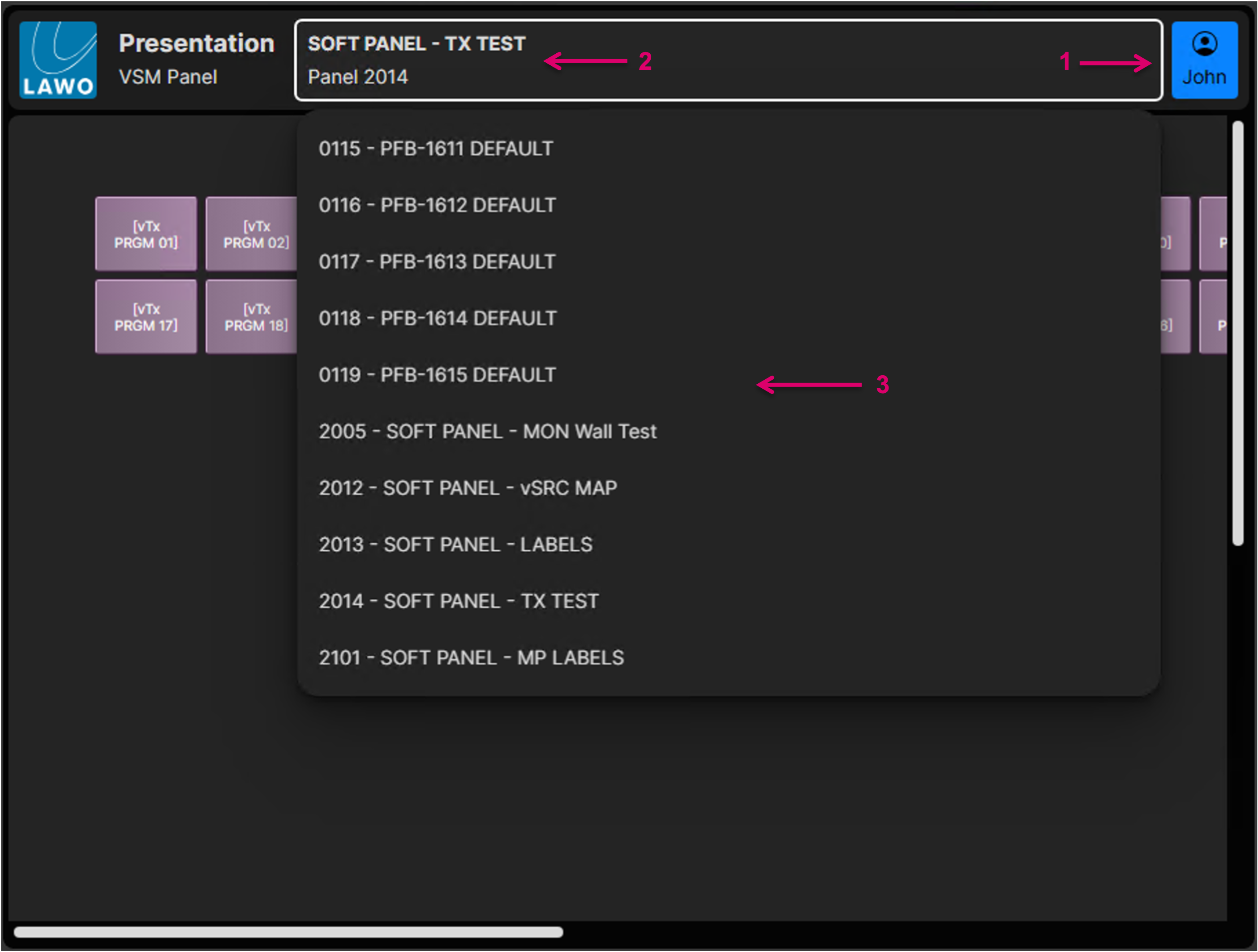 Once the User has successfully signed in, the respective Username is displayed in the top-right corner of the screen (1). The User can now access a list of assigned panels by click on the top bar (2) and select and open any of the listed panels (3).