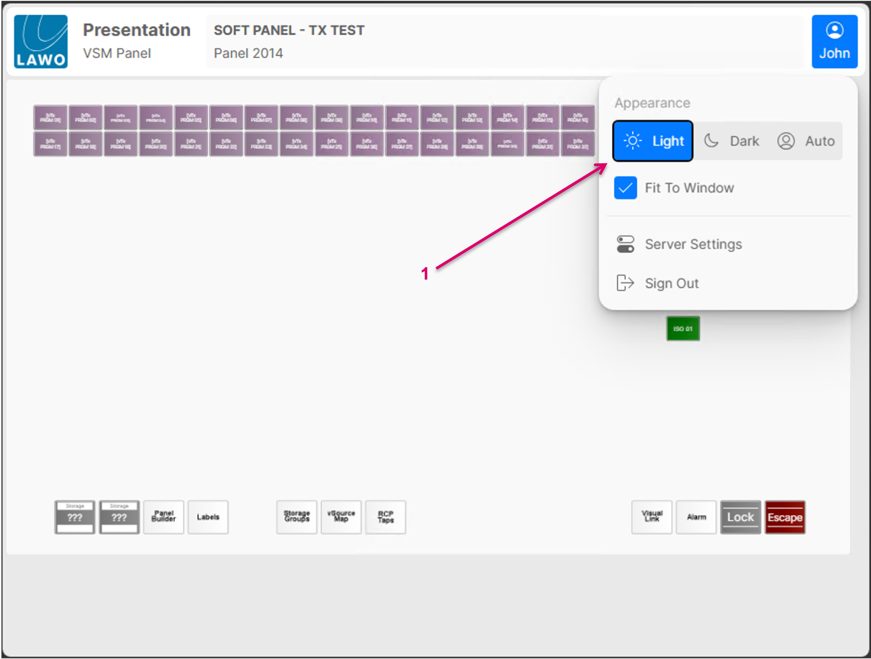 The general Appearance of the Panel can be modified with the option to switch between Light and Dark mode (1). Auto will follow the respective Server settings.